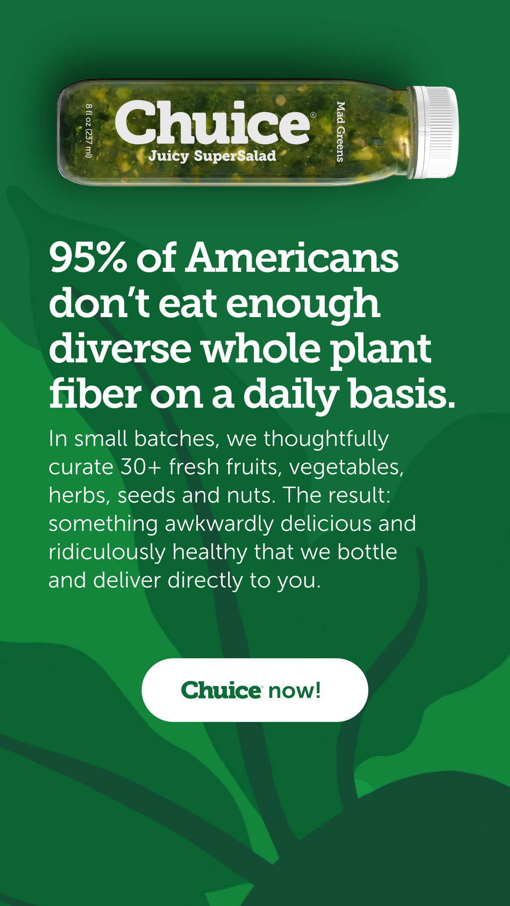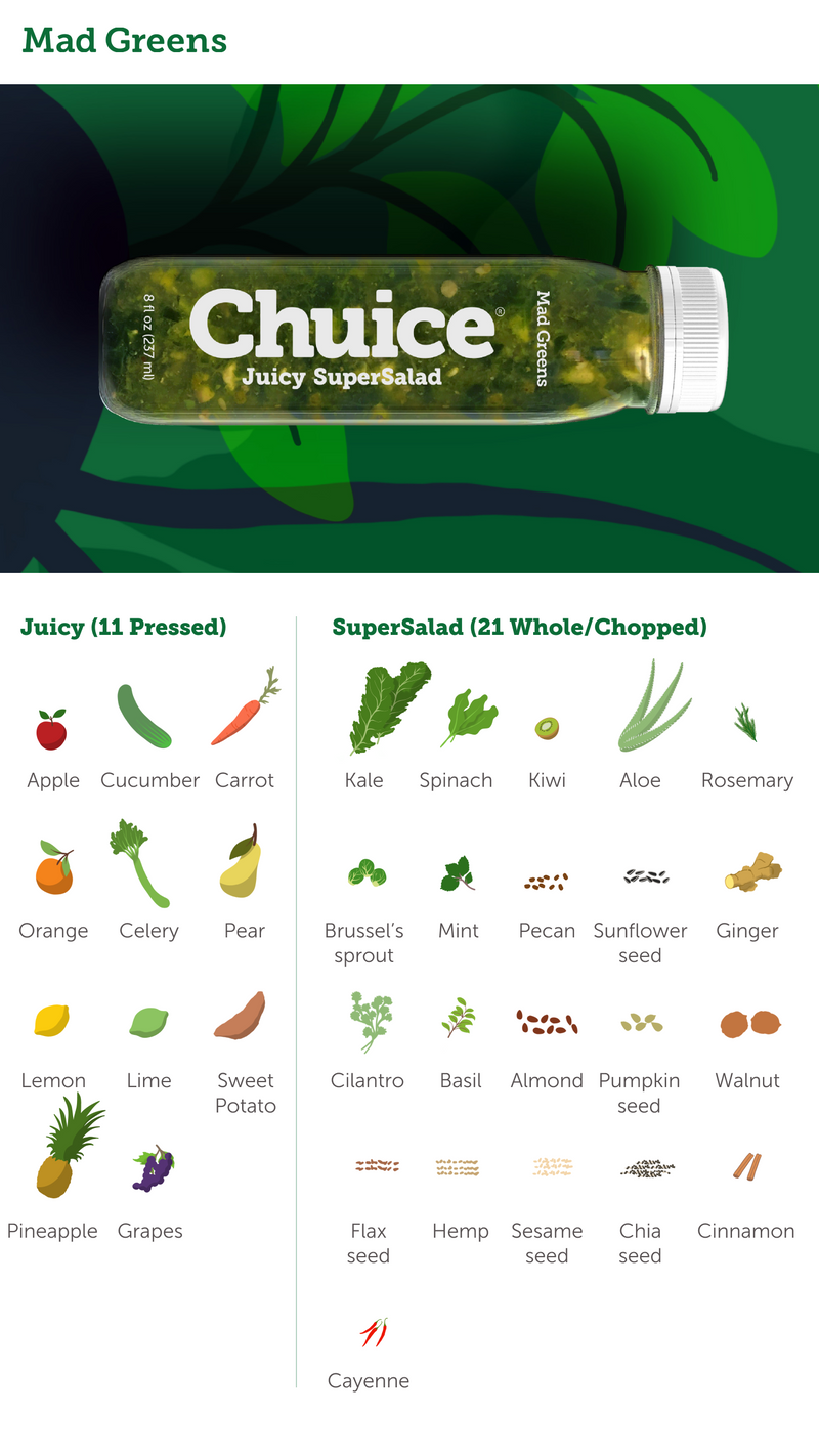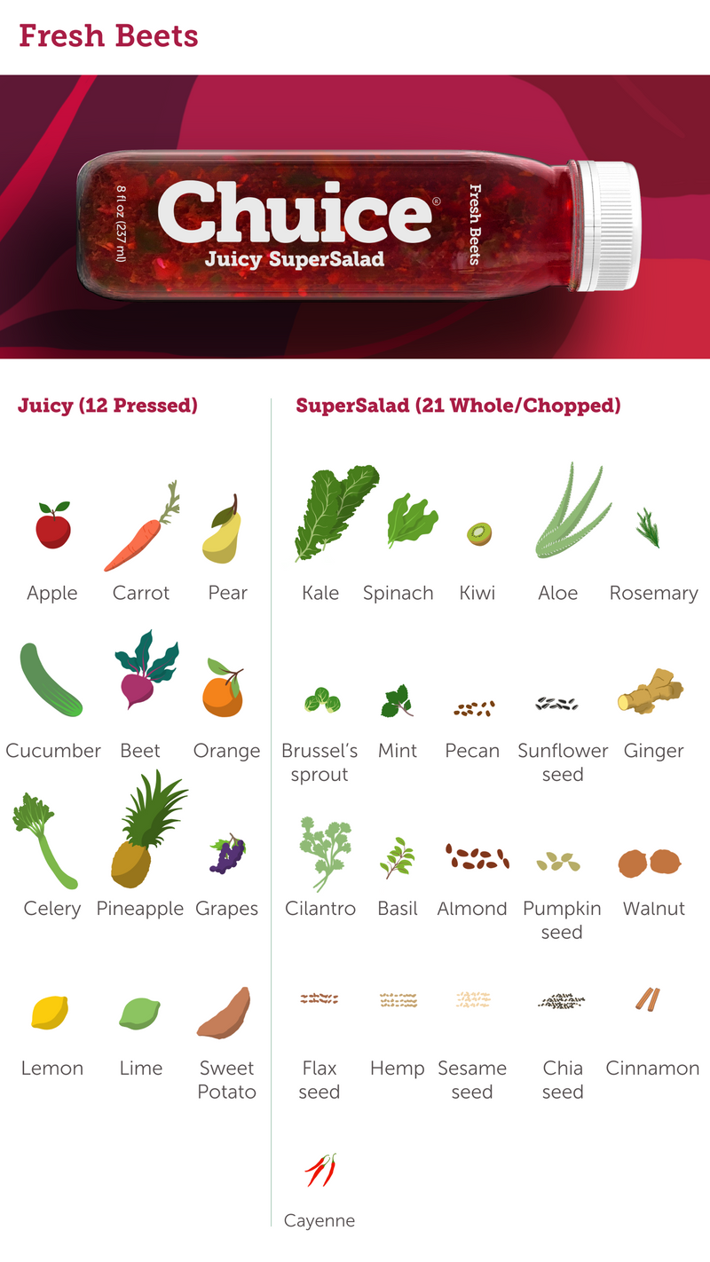 "I have been drinking Chuice since 2012 and it completely changed my health and body. Starting the morning with a fiber boost of fruits and vegetables is a complete game changer, especially if you’ve never done it before. I will forever be grateful for this magic in a bottle."