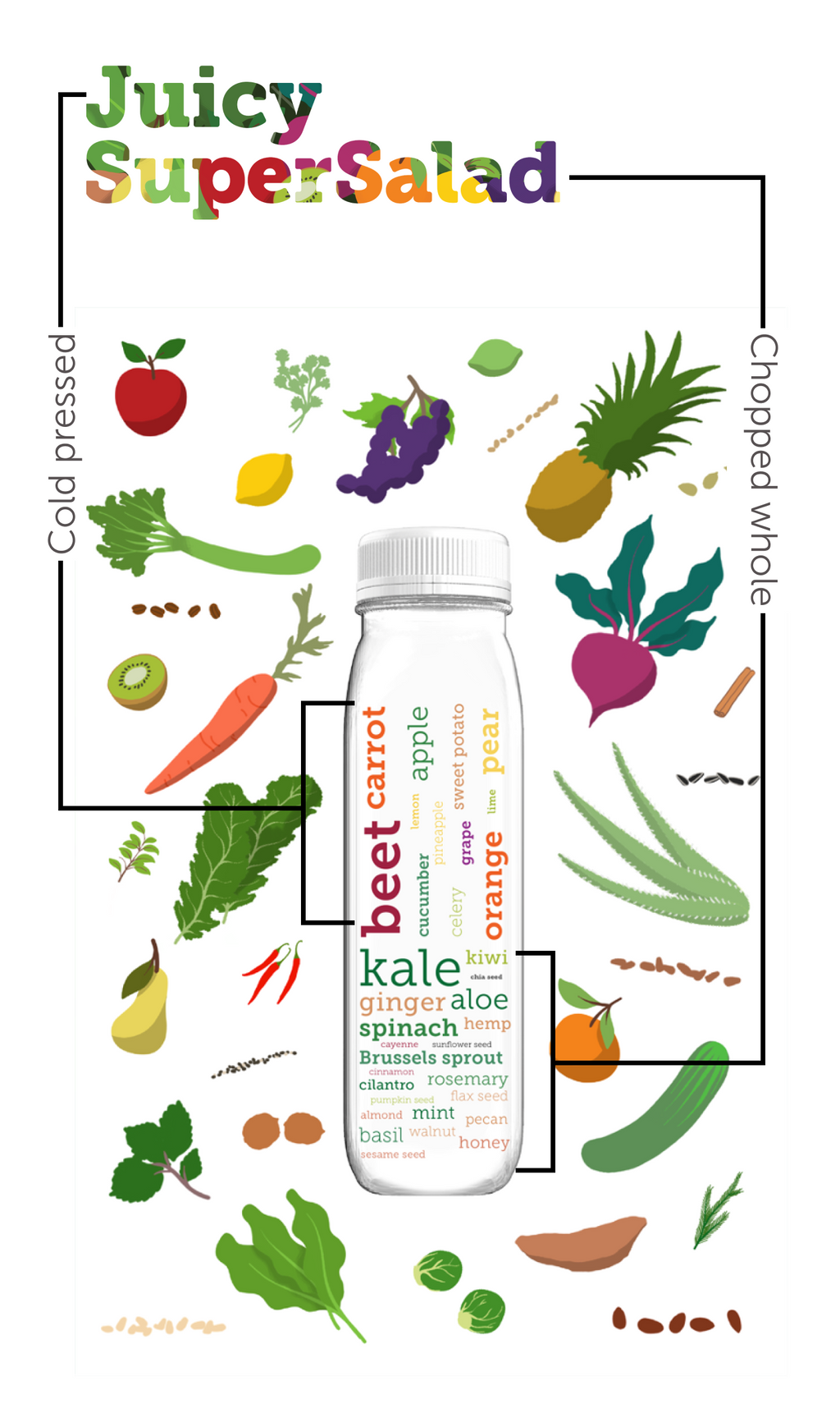 In small batches, we curate 30+ fruits, vegetables, herbs, seeds, and nuts - diverse whole plant nourishment in each and every bottle.